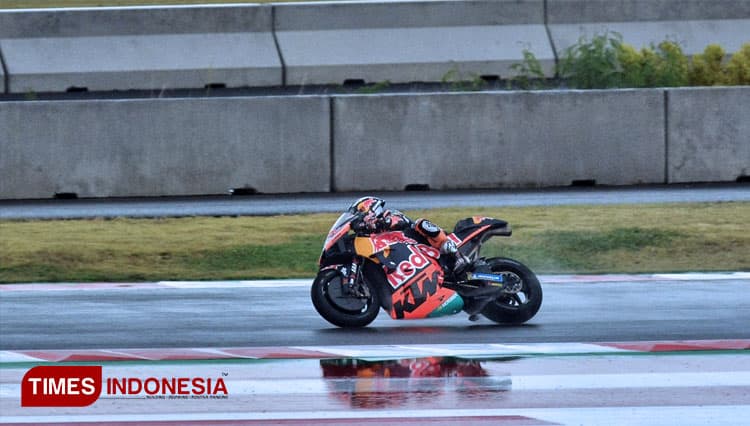 TIMES Pati/Pembalap tim Red Bull KTM, Miguel Oliveira melahap trek basah Sirkuit Mandalika, saat lomba seri kedua MotoGP di Mandalika, Lombok, NTB, Minggu (20/3/2022). (FOTO: Tria Adha/TIMES Indonesia)